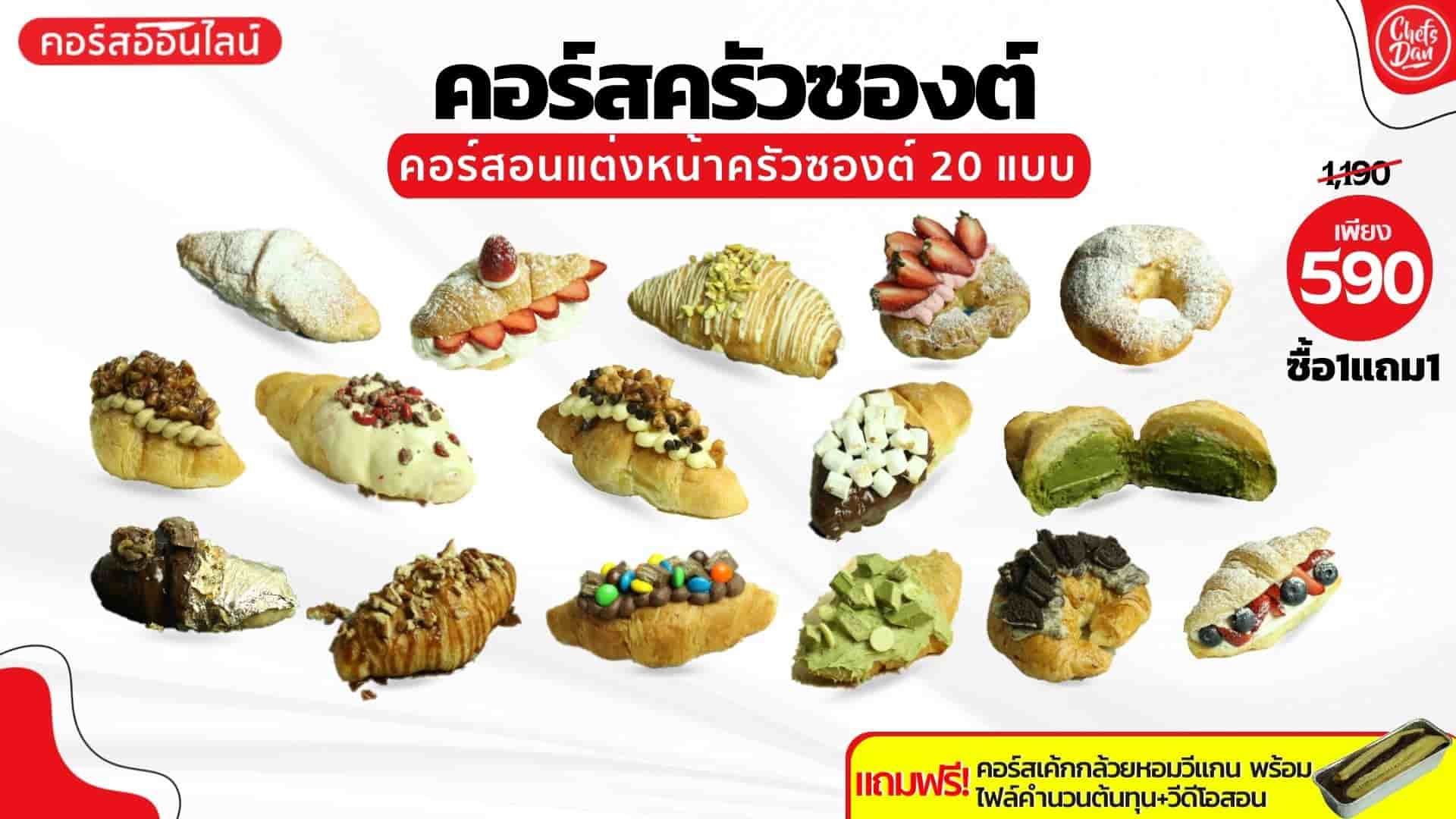 ในคอร์สนี้ เชฟแดนจะพาทุกคนทำ ” สอนแต่งหน้าและทำไส้ครัวซองต์ 20 รสชาติ ” ที่มีจุดเด่นตรงที่ทำง่าย กรอบ อร่อย ขายออนไลน์ได้ พร้อมสอนคำนวณต้นทุน